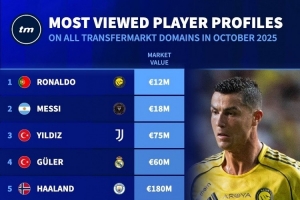 體育資訊11月2日訊 德國(guó)轉(zhuǎn)會(huì)市場(chǎng)列出了10月份球員頁面瀏覽量排名,C羅居首,梅西、伊爾迪茲二三位。