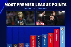 體育資訊11月9日訊 德國(guó)轉(zhuǎn)會(huì)市場(chǎng)統(tǒng)并列出近10年英超球隊(duì)總積分排名,曼城847分居首,利物浦、阿森納二三位。