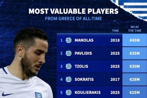 希臘球員德轉(zhuǎn)最高身價(jià)排名(取球員歷史最高身價(jià)):