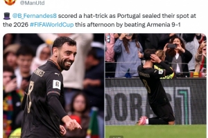 曼聯(lián)官推也曬出B費(fèi)慶祝進(jìn)球照片,配文寫道:“在葡萄牙9-1擊敗亞美尼亞的比賽中B費(fèi)上演帽子戲法,葡萄牙也鎖定世界杯參賽名額。”