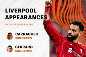 此役是薩拉赫代表利物浦出戰(zhàn)的第300場英超,英超出場次數(shù)位列利物浦隊史第五。