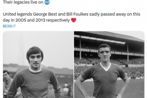 體育資訊11月25日訊 曼聯(lián)官方發(fā)文,紀念在11月25日離世的喬治·貝斯特以及比爾·??怂?。