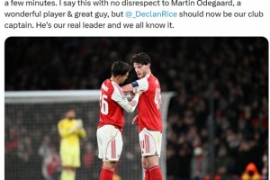 阿森納擁躉摩根在社媒曬出賴斯本場戴上隊長袖標的照片,寫道:“賴斯昨晚比賽中首次戴上阿森納隊長袖標,盡管只有幾分鐘。我這么說并不是出于對厄德高的不敬,他也是一名出色的球員、很棒的伙計,但是賴斯現(xiàn)在應該成為球隊隊長了,他是我們真正的領袖,這我們都知道的?!?/p>