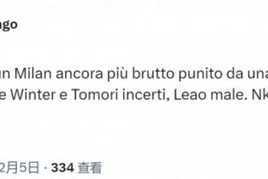 米蘭跟隊(duì)記者隆戈在社交媒體上寫(xiě)道:“一場(chǎng)糟糕的比賽,米蘭表現(xiàn)更是糟糕,被更具求勝信念的拉齊奧懲罰。德溫特和托莫里表現(xiàn)不穩(wěn),萊奧發(fā)揮不佳,至于恩昆庫(kù)——看過(guò)比賽的人都會(huì)問(wèn),他到底在哪里?”