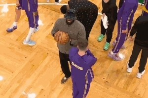 要不換衣服上場(chǎng)?暫停期間詹姆斯便裝在場(chǎng)內(nèi)拿著球 摩拳擦掌