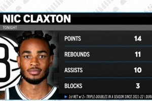 據(jù)統(tǒng)計,這是21-22賽季杜蘭特和哈登后,籃網(wǎng)首位單賽季至少2次三雙的球員。
