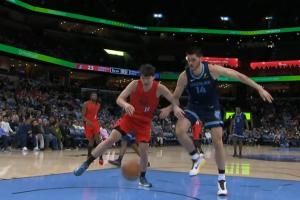 球沒拿穩(wěn)!楊瀚森搶籃板被埃迪掏掉 隨后又被砸到身上出界