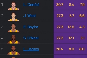 湖人生涯場(chǎng)均得分榜:東契奇30.7暫列第1 奧尼爾4 詹姆斯5 科比6