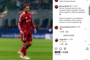 本場比賽麥卡利斯特表現(xiàn)不俗,他也在個(gè)人社媒曬出本場照片,配文寫道:“我們是利物浦,我們值得這樣的時(shí)刻。對陣強(qiáng)敵取得了一場很棒的勝利!”