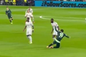 在一次攻防轉換回合中,謝爾基拿球先是晃過了巴爾韋德的鏟搶,隨后將球分出,然而回防的呂迪格一把將其撞倒在地,謝爾基躺在地上攤手一臉困惑。