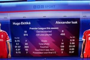 以下為利物浦兩大鋒線新援?;倏?、伊薩克本賽季英超數(shù)據(jù)對比,具體如下(括號內(nèi)為每90分鐘數(shù)據(jù)):
