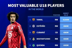 U18球員身價榜:亞馬爾2億歐居首,埃斯特旺、庫巴西8000萬歐
