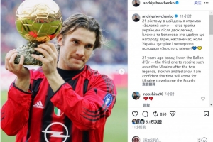 舍甫琴科社媒曬出自己與金球獎杯的合照,配文:“21年前的今天,我贏得金球獎,成為繼布洛欣和別拉諾夫之后,第三位獲得這一獎項的烏克蘭球員。我相信烏克蘭終會迎來第四位金球獎得主!”