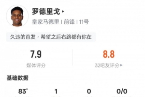 體育資訊12月15日訊 2025-26賽季西甲第16輪,皇馬對(duì)陣阿拉維斯,羅德里戈首發(fā)出戰(zhàn),打進(jìn)1粒進(jìn)球,1次過(guò)人成功,傳球成功率達(dá)到96.7%,評(píng)分7.9。