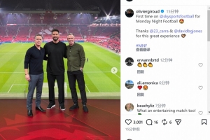 吉魯參與了曼聯(lián)vs伯恩茅斯比賽的解說工作,擔(dān)任評(píng)論嘉賓,他在社交媒體上曬出與卡拉格、大衛(wèi)·瓊斯的合照,配文:“首次參加天空體育的周一足球夜節(jié)目,感謝卡拉格和大衛(wèi)·瓊斯讓我擁有這次美妙的體驗(yàn)?!?/p>