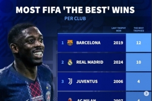 各俱樂部球員獲FIFA年度最佳次數(shù):巴薩12次居首,皇馬10次第二
