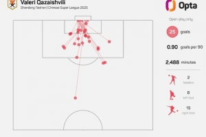 25 – 卡扎伊什維利本賽季在運動戰(zhàn)中攻入25粒進球,刷新自有紀(jì)錄以來(2012年),任一球員單賽季中超運動戰(zhàn)進球新高。