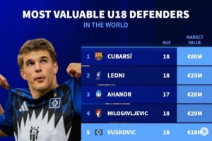 體育資訊12月17日訊 《轉(zhuǎn)會(huì)市場(chǎng)》統(tǒng)計(jì)了當(dāng)前U18后衛(wèi)身價(jià)情況,庫巴西以8千萬歐元斷崖領(lǐng)跑。