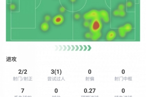 出場63分鐘,進1球,射門2次,射正2次,嘗試過人3次成功1次,丟失球權(quán)7次,預期進球0.27