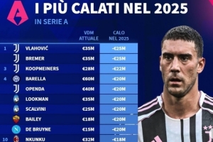 體育資訊1月1日訊 2025年已經結束,《轉會市場》也統(tǒng)計了意甲年度身價跌幅榜,弗拉霍維奇和布雷默并列最多。
