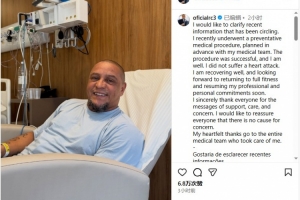 卡洛斯曬出自己在醫(yī)院的照片,并配文寫道:“我想澄清一下最近流傳的一些信息,我最近接受了一項(xiàng)預(yù)防性醫(yī)療程序,這項(xiàng)程序是事先與我的醫(yī)療團(tuán)隊(duì)商定的。程序很成功,我目前身體狀況良好,我沒有心臟病發(fā)作?!?/p>