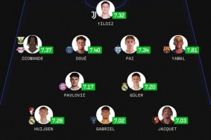 前衛(wèi):揚·迪奧曼德(萊加內(nèi)斯、萊比錫,7.37分)、杜埃(巴黎,7.40分)、帕斯(科莫,7.34分)、亞馬爾(巴薩,7.81分)