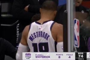 剛熱就得下了!威少剛投進本節(jié)第二記三分 下回合犯規(guī)4犯下場休息